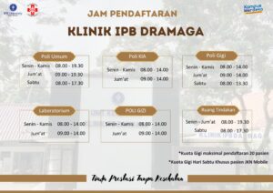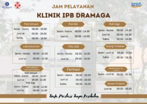 Kami ingin menginformasikan kepada Anda mengenai jadwal pelayanan kami yang dirancang untuk memenuhi kebutuhan kesehatan Anda dengan sebaik-baiknya. Di Klinik IPB Dramaga, kami berkomitmen untuk menyediakan layanan kesehatan yang berkualitas, dan salah satu cara kami mewujudkannya adalah dengan memberikan jadwal yang fleksibel dan efisien.